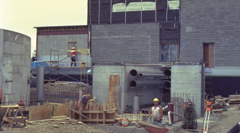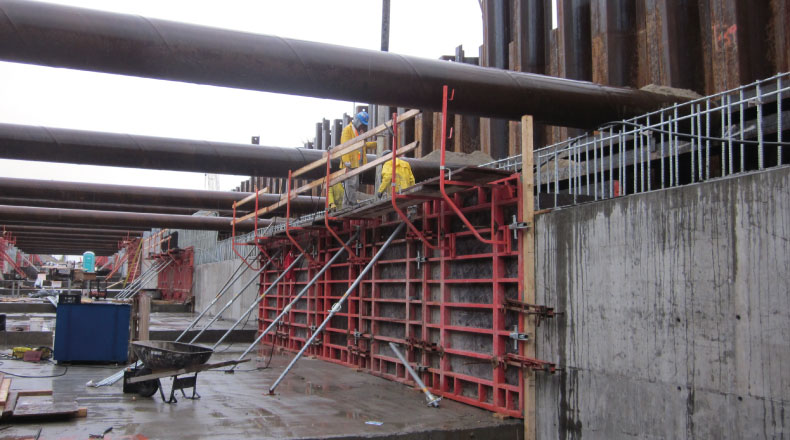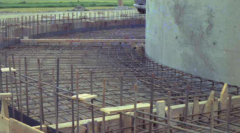 Construction d’une usine de traitement des eaux usés. Travaux complexes de coffrage et bétonnage de bassins rectangulaires et circulaires sur plusieurs niveaux.
